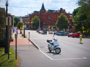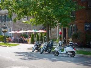 Café Lemont is a nice place. Quiet, relaxed, no music. Yet. The sort of environment where I can think. Rare in a noisy world. You meet people in places like this. Karen and Richard (apologies for my decaying memory if it’s really Robert). Karen follows Scooter in the Sticks and recognized the yellow and black jacket. Richard is a Vespa rider, or was until his scooter had an unfortunate meeting with a deer just down the road. A road where I’ve come close to meeting deer on several occasions.