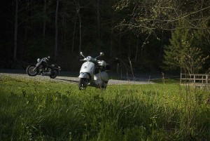 The bird hits squarely in the center of my visor with startling force. It felt like someone took a swing at me with a baseball bat. The bird careens off to the right and I give my head a shake to make sure everything is still working. The Vespa GTS and I maintain a straight line on the road and continue on our merry way.