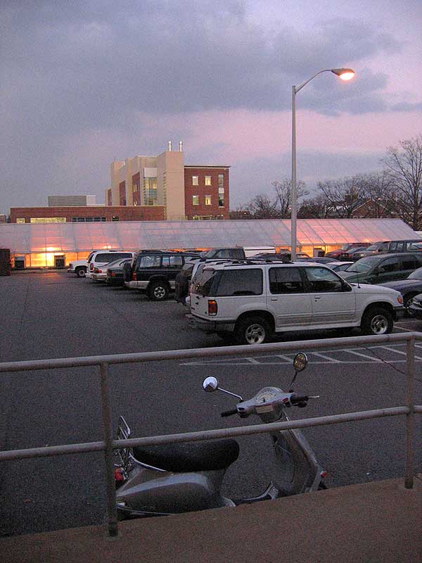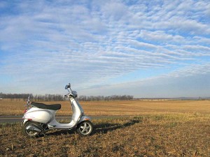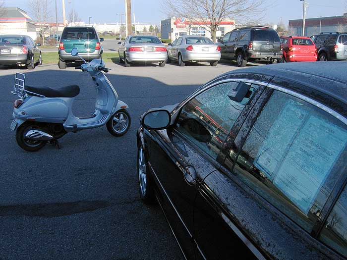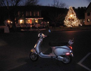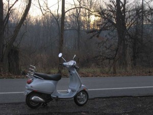 The Vespa started easily and the traction on the snow-covered road was good for the first half mile. I stopped to make a picture (excuse the fuzziness, it was actually still pretty dark and I didn’t want to pull out the tripod) as the road turned from snow to a glaze of ice from all the traffic. Once I got on the main road it was chemically wet compliments of PENNDOT. I was grateful that there was almost no traffic as I slowly made my way to work. There were slippery spots here and there and stopping at one traffic light was a bit challenging and required my outriggers down to manage the slow stop/slide.