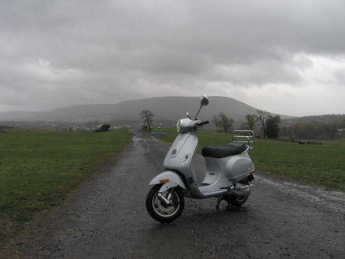 I had gone over the Vespa carefully the night before and made sure everything was mechanically sound so I could roll it out of the garage and go. Paul arrived on his bright yellow Suzuki DRZ400 SuperMoto and off we went. We were only 10 miles out when we stopped to add some more gear. I put on a windproof Mountain Hardware jacket on under my First Gear jacket and Paul pulled on some waterproof and windproof covers over his gloves because his fingertips were getting numb. My hands were still fine but by midday I was looking at every motorcycle store for a pair myself.